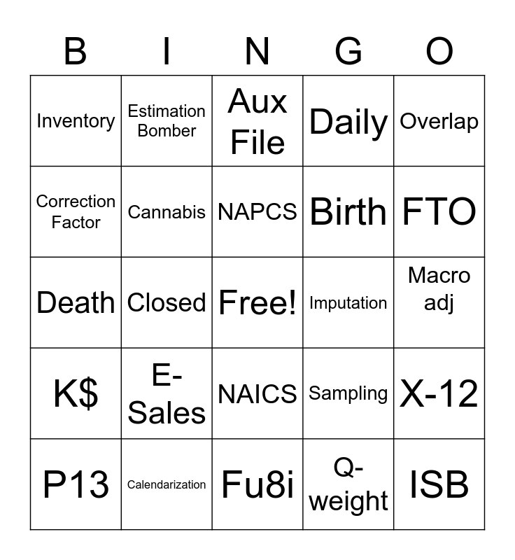 This bingo card has a free space and 24 words: E-Sales, Calendarization, NAPCS, P13, Overlap, Inventory, Correction Factor, Estimation Bomber, Imputation, NAICS, Birth, Death, Sampling, X-12, Cannabis, Q-weight, Macro adj, Aux File, FTO, Closed, ISB, K$, Daily and Fu8i.