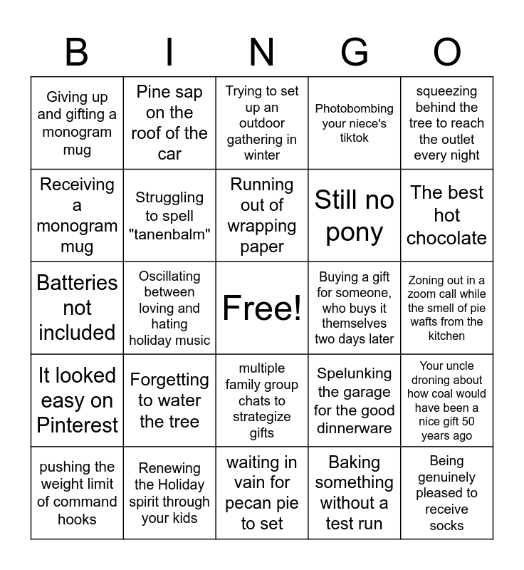 This bingo card has a free space and 25 words: Forgetting to water the tree, waiting in vain for pecan pie to set, Running out of wrapping paper, pushing the weight limit of command hooks, squeezing behind the tree to reach the outlet every night, Giving up and gifting a monogram mug, Receiving a monogram mug, Pine sap on the roof of the car, Buying a gift for someone, who buys it themselves two days later, multiple family group chats to strategize gifts, Still no pony, Batteries not included, Spelunking the garage for the good dinnerware, Your uncle droning about how coal would have been a nice gift 50 years ago, Struggling to spell "tanenbalm", All of the holiday classics available on the streaming service you don't have, Zoning out in a zoom call while the smell of pie wafts from the kitchen, Trying to set up an outdoor gathering in winter, The best hot chocolate, Oscillating between loving and hating holiday music, Being genuinely pleased to receive socks, Renewing the Holiday spirit through your kids, It looked easy on Pinterest, Photobombing your niece's tiktok and Baking something without a test run.