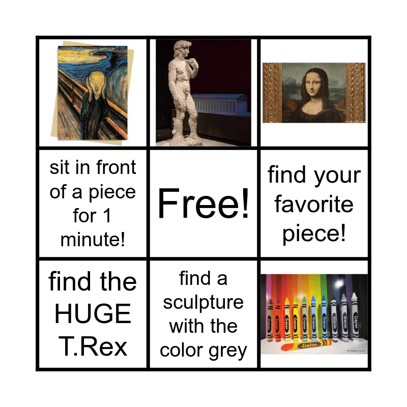 This bingo card has 4 images, a free space and 4 words: find your favorite piece!, find the HUGE T.Rex, sit in front of a piece for 1 minute! and find a sculpture with the color grey.