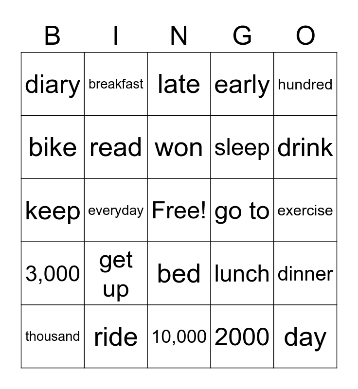 This bingo card has a free space and 24 words: get up, ride, won, thousand, hundred, diary, bike, breakfast, go to, bed, sleep, keep, lunch, dinner, read, 2000, exercise, late, drink, everyday, day, 3,000, early and 10,000.