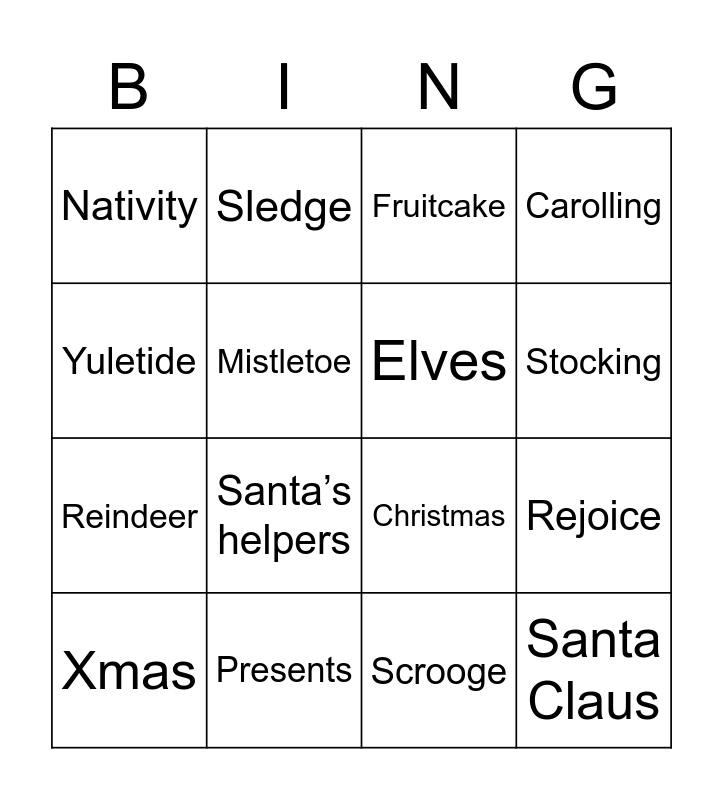 This bingo card has 62 words: Christmas, Merry, Festive, Santa Claus, Saint Nicholas, Kris Kringle, Elves, Jolly, Reindeer, Carols, Carolling, Carolers, Mistletoe, Frankincense, Myrrh, Nativity, Xmas, Yuletide, Tinsel, Stocking, Presents, Fruitcake, Chimney, Birth, Family, Candy, Pinecone, Spirit, Tidings, Tradition, Rudolph, Sleigh, Holiday, Ornaments, Scrooge, Sledge, St. Nicks, Snowman, Rejoice, Father, Christmas, Christmas Eve, Christmas tree, Jack Frost, Santa’s helpers, Santa’s workshop, Christmas carol, Christmas card, Frosty the Snowman, December 25, Sleigh bells, Gingerbread house, North Pole, Plum pudding, Season’s greetings, Celebrate, Christmas tree stand, Chestnuts, Angel, Elf, Feast and Goose.