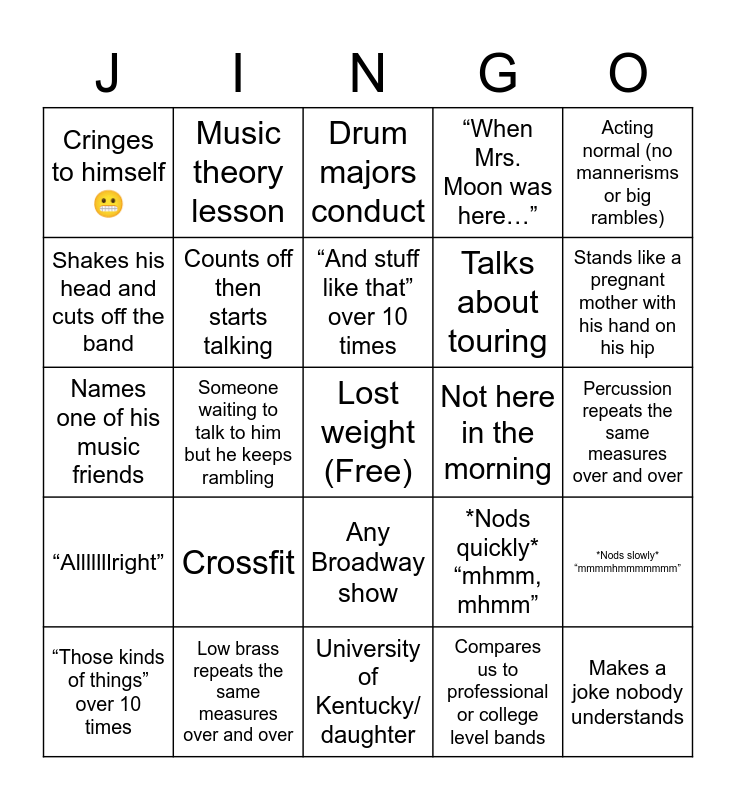 This bingo card has a free space and 24 words: Crossfit, Low brass repeats the same measures over and over, “And stuff like that” over 10 times, “Those kinds of things” over 10 times, Acting normal (no mannerisms or big rambles), Cringes to himself😬, Shakes his head and cuts off the band, Music theory lesson, Not here in the morning, Any Broadway show, Talks about touring, Names one of his music friends, *Nods quickly* “mhmm, mhmm”, *Nods slowly* “mmmmhmmmmmmm”, Counts off then starts talking, Compares us to professional or college level bands, Percussion repeats the same measures over and over, Drum majors conduct, Stands like a pregnant mother with his hand on his hip, Someone waiting to talk to him but he keeps rambling, Makes a joke nobody understands, “Alllllllright”, “When Mrs. Moon was here…” and University of Kentucky/ daughter.