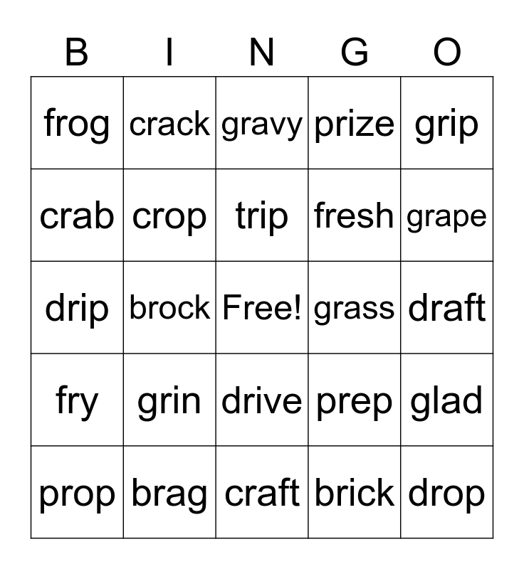 This bingo card has a free space and 24 words: grin, brag, trip, prop, grip, frog, crab, crack, grass, drive, fresh, drip, prep, glad, crop, brick, draft, gravy, grape, brock, drop, fry, prize and craft.