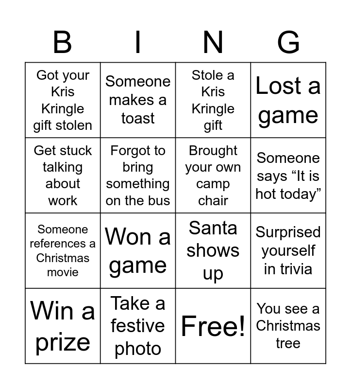 This bingo card has 17 words: Free!, Win a prize, Stole a Kris Kringle gift, Got your Kris Kringle gift stolen, Won a game, Lost a game, Surprised yourself in trivia, Brought your own camp chair, Someone says “It is hot today”, Forgot to bring something on the bus, Take a festive photo, Santa shows up, Get stuck talking about work, Someone makes a toast, Someone references a Christmas movie, Someone says “Happy Holidays” and You see a Christmas tree.