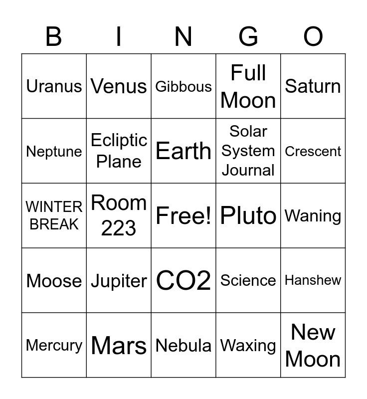 This bingo card has a free space and 24 words: Jupiter, Mars, Earth, Mercury, Saturn, Uranus, Neptune, Venus, Pluto, CO2, Solar System Journal, WINTER BREAK, Science, Hanshew, Ecliptic Plane, Waxing, Waning, Gibbous, Crescent, Room 223, New Moon, Moose, Full Moon and Nebula.