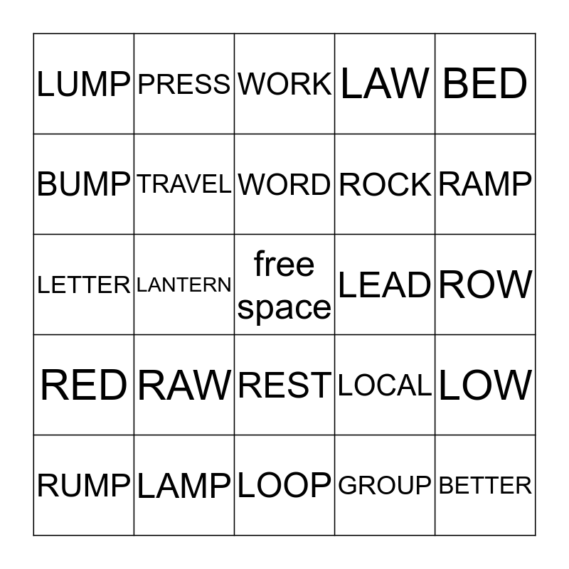 This bingo card has a free space and 24 words: RAW, LAMP, WORD, RUMP, BED, LUMP, BUMP, PRESS, LEAD, REST, ROCK, LETTER, LOCAL, LOW, TRAVEL, GROUP, ROW, WORK, RAMP, LANTERN, BETTER, RED, LAW and LOOP.