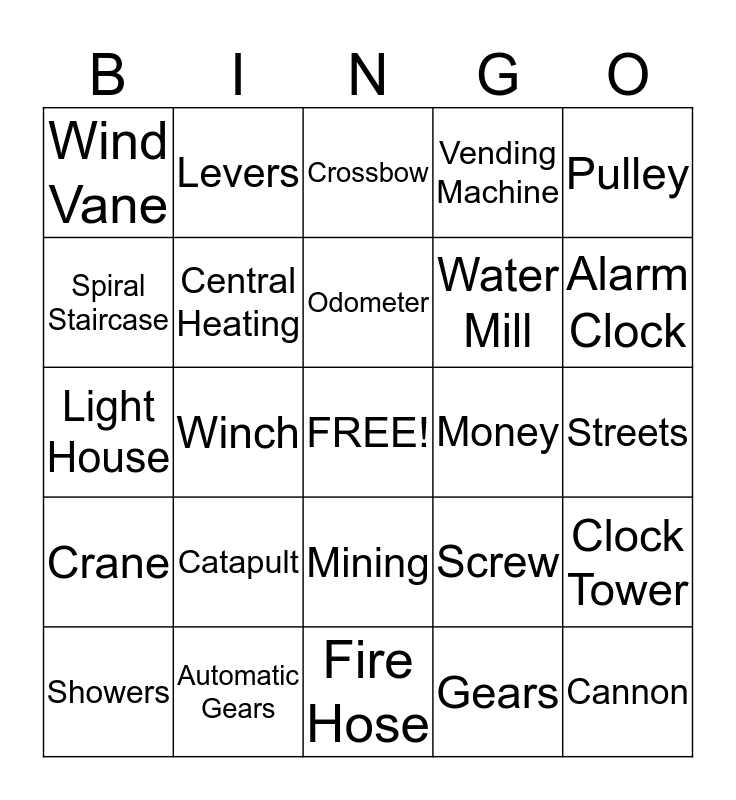 This bingo card has a free space and 24 words: Catapult, Automatic Gears, Odometer, Showers, Pulley, Wind Vane, Spiral Staircase, Levers, Money, Mining, Water Mill, Light House, Screw, Clock Tower, Central Heating, Gears, Streets, Crossbow, Alarm Clock, Winch, Cannon, Crane, Vending Machine and Fire Hose.
