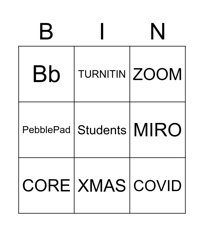 This bingo card has a free space and 8 words: MIRO, ZOOM, TURNITIN, CORE, Bb, COVID, PebblePad and XMAS.