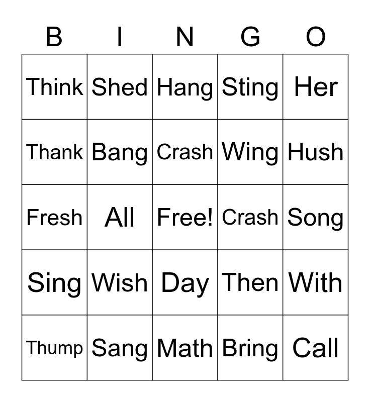This bingo card has a free space and 27 words: Then, Shut, Wing, Math, Thank, Hang, Shed, Sing, Crash, With, Fresh, Sting, Thump, Sang, Hush, That, Bang, Crash, Wish, Think, Song, Bring, All, Call, Day, Her and Want.