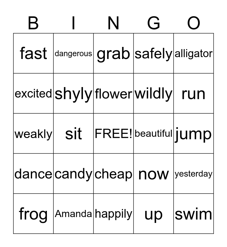 This bingo card has a free space and 24 words: candy, Amanda, flower, frog, alligator, fast, excited, dangerous, beautiful, cheap, wildly, weakly, now, yesterday, shyly, up, jump, grab, run, sit, swim, dance, safely and happily.