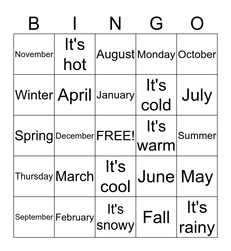 This bingo card has a free space and 24 words: March, February, January, September, October, November, Winter, It's hot, It's warm, It's cool, It's cold, Spring, June, May, April, Fall, Summer, August, July, December, It's rainy, Thursday, Monday and It's snowy.