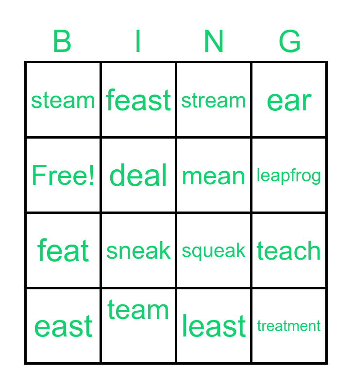 This bingo card has 16 words: team, teach, stream, steam, feat, feast, squeak, least, Free!, deal, east, ear, sneak, leapfrog, mean and treatment.