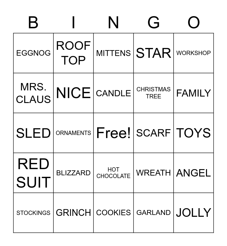 This bingo card has a free space and 24 words: BLIZZARD, GRINCH, CANDLE, STOCKINGS, WORKSHOP, EGGNOG, MRS. CLAUS, ROOF TOP, SCARF, HOT CHOCOLATE, CHRISTMAS TREE, SLED, WREATH, ANGEL, NICE, GARLAND, TOYS, MITTENS, FAMILY, ORNAMENTS, JOLLY, RED SUIT, STAR and COOKIES.