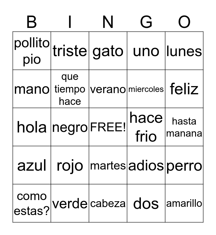 This bingo card has a free space and 24 words: rojo, verde, verano, como estas?, lunes, pollito pio, mano, triste, hace frio, martes, miercoles, hola, adios, perro, que tiempo hace, dos, hasta manana, gato, feliz, negro, amarillo, azul, uno and cabeza.