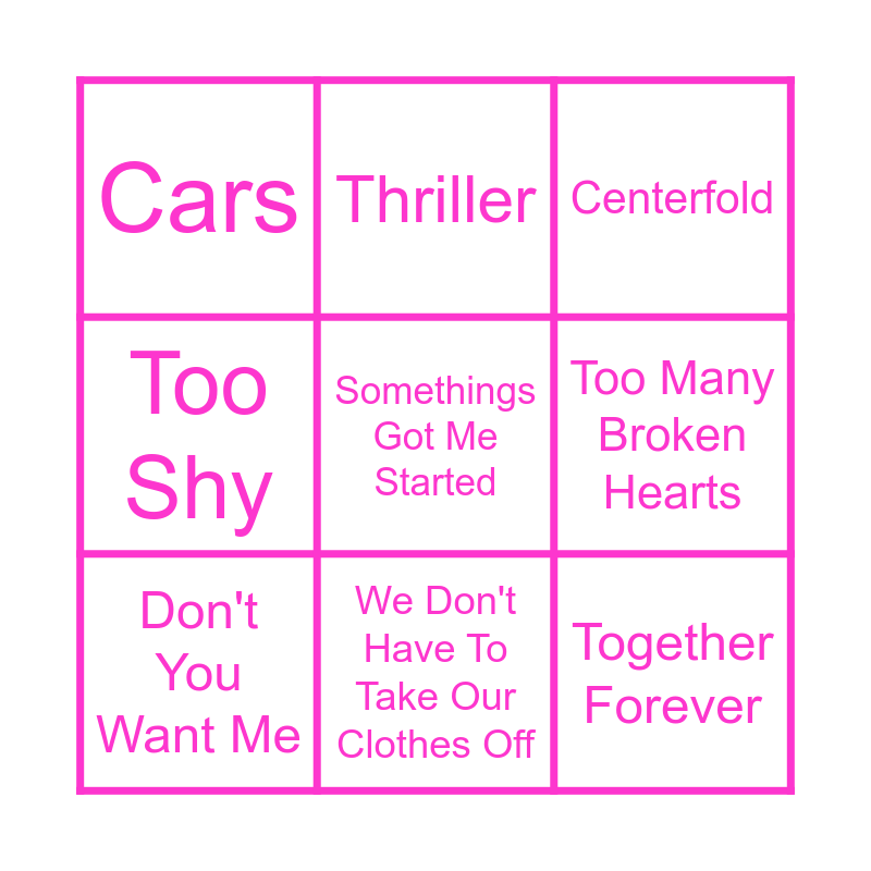 This bingo card has 30 words: A Good Heart, Ashes To Ashes, Baggy Trousers, Billie Jean, Cars, Centerfold, Don't You Want Me, Easy Lover, Eye Of The Tiger, Geno, Ghost Town, Give It Up, If I Was, Just An Illusion, Ladies Night, Pass The Dutchie, Purple Rain, Seven Wonders, She Drives Me Crazy, Somethings Got Me Started, Sweet Dreams, The Power Of Love, Thriller, Together Forever, Too Many Broken Hearts, Too Shy, Two Tribes, Video Killed The Radio Star, We Don't Have To Take Our Clothes Off and You Take Me Up.