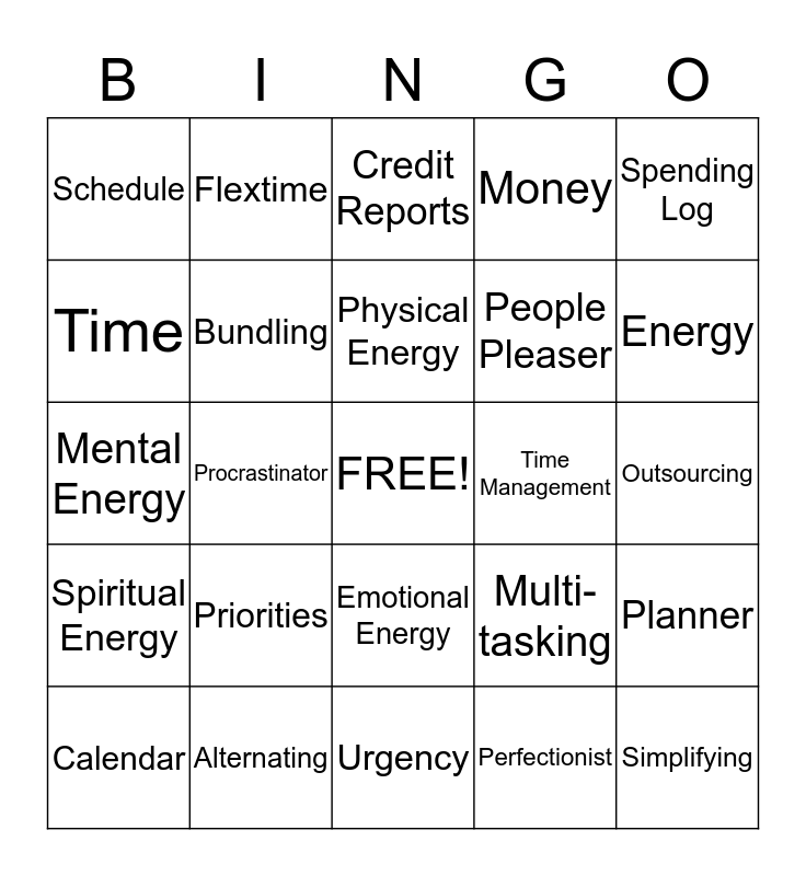 This bingo card has a free space and 24 words: Priorities, Alternating, Physical Energy, Calendar, Spending Log, Schedule, Time, Flextime, Time Management, Emotional Energy, People Pleaser, Mental Energy, Multi- tasking, Planner, Bundling, Perfectionist, Outsourcing, Credit Reports, Energy, Procrastinator, Simplifying, Spiritual Energy, Money and Urgency.