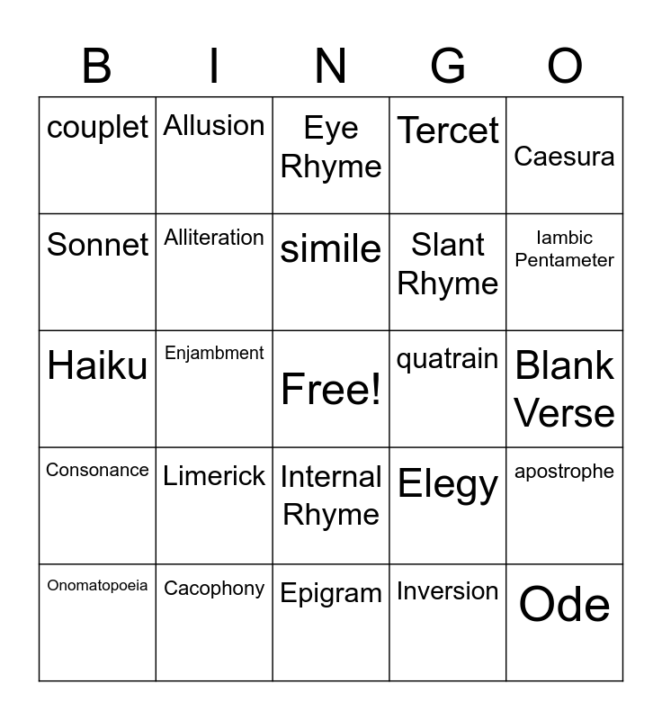 This bingo card has a free space and 29 words: Onomatopoeia, Euphony, Enjambment, assonance, couplet, Eye Rhyme, Alliteration, Limerick, quatrain, Cacophony, Blank Verse, Ode, Epigram, Inversion, Iambic Pentameter, Falling Meter, Internal Rhyme, Consonance, Caesura, Haiku, Elegy, Rising Meter, Slant Rhyme, Sonnet, Tercet, Allusion, apostrophe, simile and metaphor.