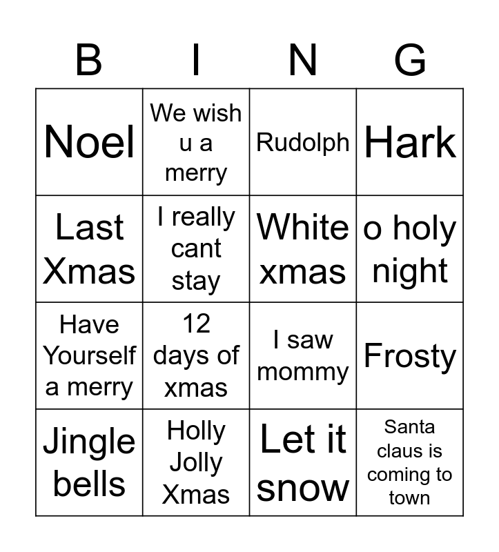 This bingo card has 16 words: Holly Jolly Xmas, Frosty, Rudolph, Noel, Have Yourself a merry, We wish u a merry, I saw mommy, Let it snow, Last Xmas, I really cant stay, Jingle bells, Hark, 12 days of xmas, o holy night, White xmas and Santa claus is coming to town.
