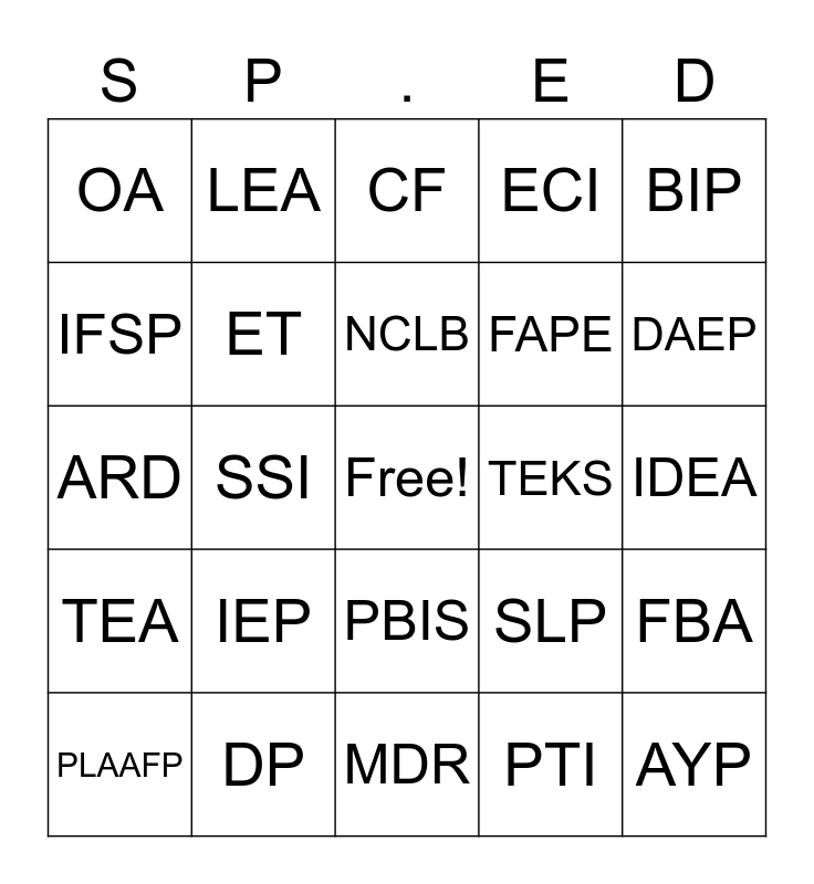 This bingo card has a free space and 24 words: IEP, DP, NCLB, PLAAFP, BIP, OA, IFSP, LEA, TEKS, PBIS, FAPE, ARD, SLP, FBA, ET, PTI, IDEA, CF, DAEP, SSI, AYP, TEA, ECI and MDR.