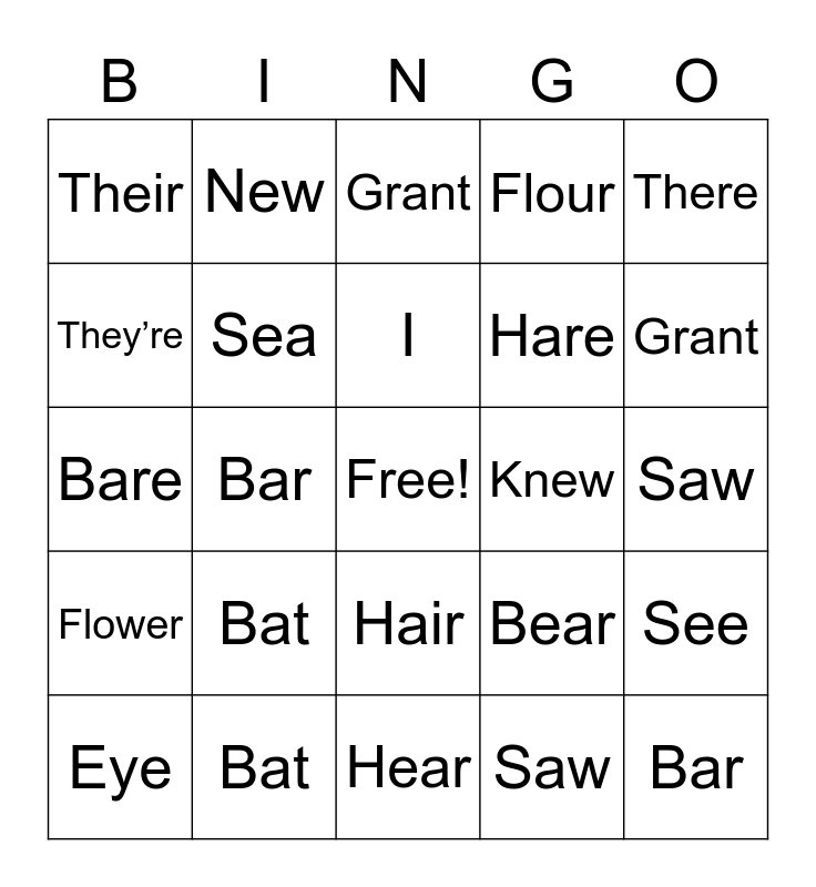 This bingo card has a free space and 24 words: Bat, Bat, I, Eye, There, Their, They’re, New, Knew, Hair, Hare, Bare, Bear, See, Sea, Saw, Saw, Grant, Grant, Bar, Bar, Flower, Flour and Hear.