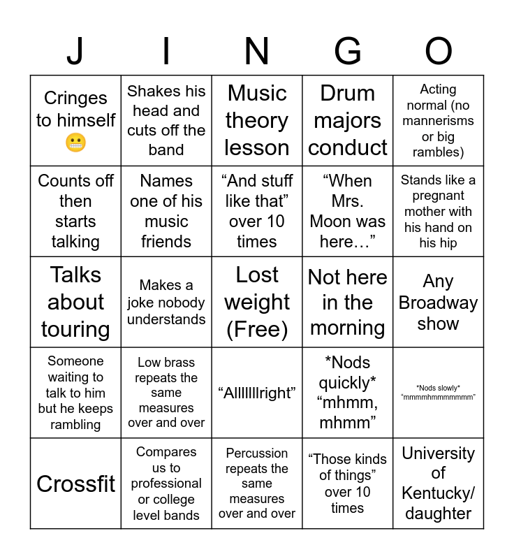 This bingo card has a free space and 24 words: Crossfit, Low brass repeats the same measures over and over, “And stuff like that” over 10 times, “Those kinds of things” over 10 times, Acting normal (no mannerisms or big rambles), Cringes to himself😬, Shakes his head and cuts off the band, Music theory lesson, Not here in the morning, Any Broadway show, Talks about touring, Names one of his music friends, *Nods quickly* “mhmm, mhmm”, *Nods slowly* “mmmmhmmmmmmm”, Counts off then starts talking, Compares us to professional or college level bands, Percussion repeats the same measures over and over, Drum majors conduct, Stands like a pregnant mother with his hand on his hip, Someone waiting to talk to him but he keeps rambling, Makes a joke nobody understands, “Alllllllright”, “When Mrs. Moon was here…” and University of Kentucky/ daughter.