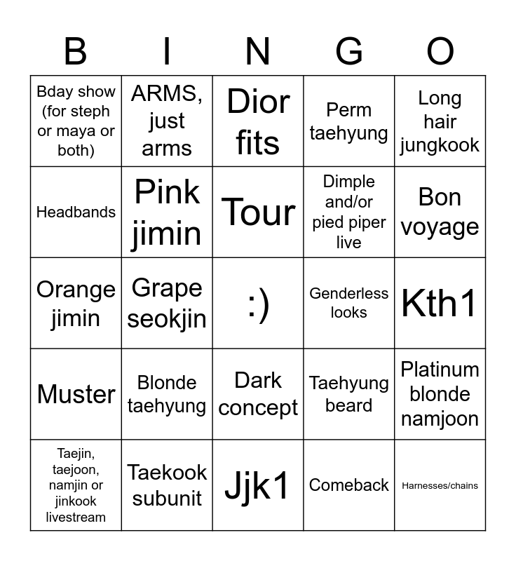 This bingo card has a free space and 24 words: Blonde taehyung, Taekook subunit, Tour, Taejin, taejoon, namjin or jinkook livestream, Long hair jungkook, Bday show (for steph or maya or both), Headbands, ARMS, just arms, Genderless looks, Dark concept, Dimple and/or pied piper live, Orange jimin, Taehyung beard, Platinum blonde namjoon, Pink jimin, Comeback, Kth1, Dior fits, Bon voyage, Grape seokjin, Harnesses/chains, Muster, Perm taehyung and Jjk1.