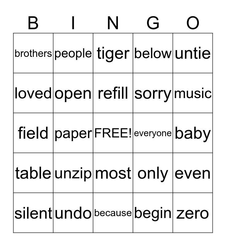 This bingo card has a free space and 24 words: unzip, undo, refill, silent, untie, brothers, loved, people, everyone, most, sorry, field, only, even, open, begin, baby, tiger, music, paper, zero, table, below and because.