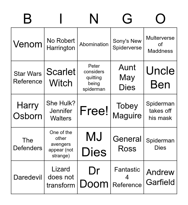 This bingo card has a free space and 24 words: One of the other avengers appear (not strange), Lizard does not transform, Peter considers quitting being spiderman, Daredevil, Multerverse of Maddness, Venom, Star Wars Reference, No Robert Harrington, Tobey Maguire, MJ Dies, Aunt May Dies, Harry Osborn, General Ross, Spiderman Dies, Scarlet Witch, Fantastic 4 Reference, Spiderman takes off his mask, Abomination, Uncle Ben, She Hulk? Jennifer Walters, Andrew Garfield, The Defenders, Sony's New Spiderverse and Dr Doom.