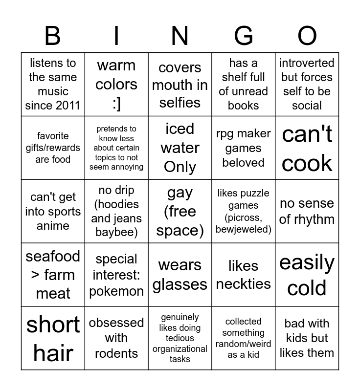 This bingo card has a free space and 24 words: special interest: pokemon, obsessed with rodents, iced water Only, short hair, introverted but forces self to be social, listens to the same music since 2011, favorite gifts/rewards are food, warm colors :], likes puzzle games (picross, bewjeweled), wears glasses, rpg maker games beloved, can't get into sports anime, likes neckties, easily cold, pretends to know less about certain topics to not seem annoying, collected something random/weird as a kid, no sense of rhythm, covers mouth in selfies, can't cook, no drip (hoodies and jeans baybee), bad with kids but likes them, seafood > farm meat, has a shelf full of unread books and genuinely likes doing tedious organizational tasks.