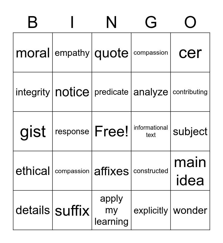 This bingo card has a free space and 28 words: main idea, respect, analyze, explicitly, integrity, quote, empathy, ethical, informational text, details, gist, compassion, suffix, apply my learning, contributing, notice, compassion, notice, predicate, affixes, moral, predicate, wonder, response, subject, constructed, cer and Narrative.