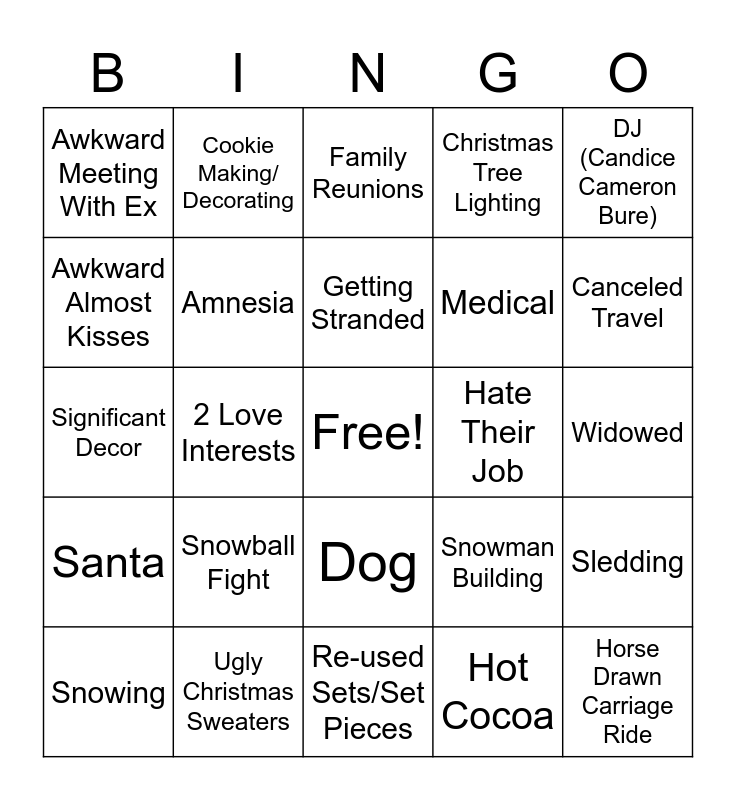 This bingo card has a free space and 53 words: Ice Skating, Horse Drawn Carriage Ride, Christmas Tree Shopping, Hot Cocoa, Snowball Fight, Christmas Tree Decorating, Cookie Making/ Decorating, Accidents, Awkward Almost Kisses, Christmas Carols, Amnesia, Death, Sledding, Snowman Building, Slow Dancing, Snowing, Getting Stranded, Hate Their Job, Last Minute Travel, DJ (Candice Cameron Bure), 2 Love Interests, Military, Medical, Awkward Meeting With Ex, Enemies to Lovers, Ugly Christmas Sweaters, Hometown Christmas Name, Childhood Friends to Lovers, Christmas Festival, Canceled Travel, Instrumental Talent, Dramatic Misunderstanding, Token Gay, Wrapping Presents, Interrupted Kiss, Royalty, Christmas Tree Lighting, Re-used Sets/Set Pieces, Family Reunions, Fundraisers, Single Parent, Re-used Actor/Actress, Widowed, Divorced, Custom Christmas Song, Dog, Obvious Advertisement, Christmas Crafts, Significant Decor, Santa, Hot Cider, Gingerbread Houses and Holiday Competition.