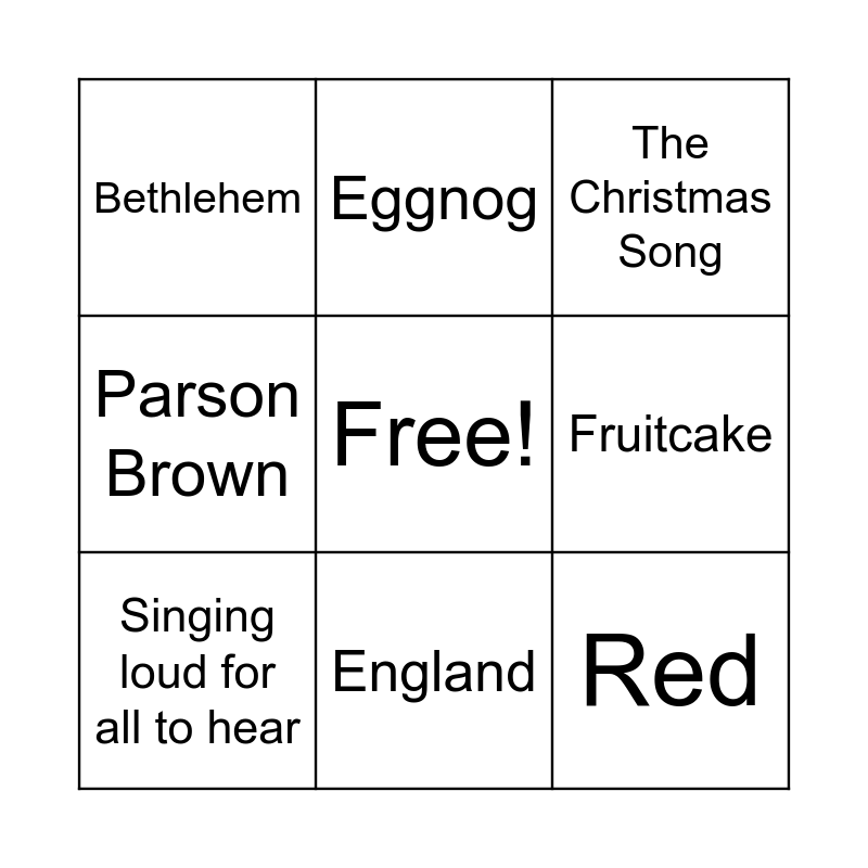 This bingo card has a free space and 8 words: Fruitcake, The Christmas Song, Eggnog, Singing loud for all to hear, Bethlehem, Red, Parson Brown and England.