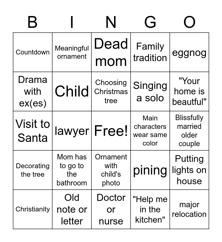 This bingo card has a free space and 77 words: Hot cocoa, mistletoe, Dead mom, Dead dad, Dead brother, Dead sister, Dead parents, tree lighting, Denver, NYC, Local holiday event, At least 2 interrupted kisses, Choosing Christmas tree, Drama with ex(es), misunderstanding sighting with person, lawyer, wreath making, major relocation, major career change, eggnog, Main guy dressed as Santa, Visit to Santa, Child, Meaningful ornament, Family tradition, 10 min left: Everything terrible, Main girl dressed up; main guy: "Wow", Snow as a plot point, Snow globe, We Wish You a Merry Christmas, Joy to the World, O Christmas Tree, dog, pining, "Your home is beautful", Singing a solo, Christmas pageant, Hates Christmas at start; loves it at end, Blissfully married older couple, "Help me in the kitchen", "Christmas magic", Christmas "is about family", best friend is a POC, Best friend gives main character "the look", "You need to get back out there", takeout, Christianity, Countdown, S'mores, car accident, cancer, Ornament with child's photo, tree topper is a big deal, "It's not a date", "We're just friends", ice skating, workaholic, G-bread houses, G-bread cookies, Interrution of important conversation, Mom has to go to the bathroom, Toby has to go to the bathroom, Ring box - no ring, Ring box with ring, Snowball fight, "It's a Wonderful Life", Guy is a chef/baker, Main characters wear same color, caroling, Christmas wedding, Building a snowman, Putting lights on house, Decorating the tree, Old note or letter, Plan to spend Christmas alone, Doctor or nurse and Family reconciliation.