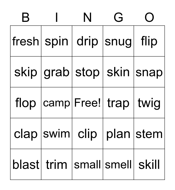 This bingo card has a free space and 29 words: blast, flag, camp, prize, fresh, drip, grab, swim, trap, trim, twig, skill, small, smell, snap, crib, clip, clap, flip, flop, plan, slid, skin, skip, snug, spin, stem, stop and step.