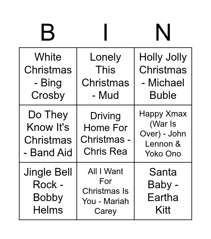 This bingo card has 11 words: Santa Baby - Eartha Kitt, All I Want For Christmas Is You - Mariah Carey, Driving Home For Christmas - Chris Rea, Jingle Bell Rock - Bobby Helms, Lonely This Christmas - Mud, Holly Jolly Christmas - Michael Buble, Happy Xmax (War Is Over) - John Lennon & Yoko Ono, I Wish It Could Be Christmas Every Day - Wizzard, Do They Know It's Christmas - Band Aid, White Christmas - Bing Crosby and Mary's Boy Child - Boney M.