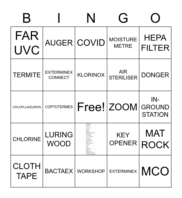 This bingo card has 1 images, a free space and 25 words: EXTERMINEX, KLORINOX, BACTAEX, HEPA FILTER, FAR UVC, TERMITE, AUGER, IN-GROUND STATION, KEY OPENER, AIR STERILISER, CHLOFLUAZURON, MAT ROCK, CLOTH TAPE, COPTOTERMES, DNA KIT, MOISTURE METRE, CHLORINE, COVID, MCO, DONGER, WORKSHOP, ZOOM, LURING WOOD, EXTERMINEX CONNECT and SODIUM HYPOCHLORITE.