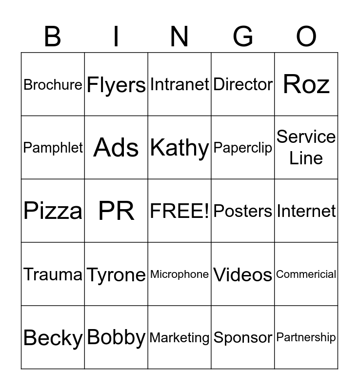 This bingo card has a free space and 24 words: Tyrone, Bobby, Kathy, Becky, Roz, Brochure, Pamphlet, Flyers, Posters, Microphone, Paperclip, Pizza, Videos, Commericial, Ads, Sponsor, Internet, Intranet, Service Line, PR, Partnership, Trauma, Director and Marketing.