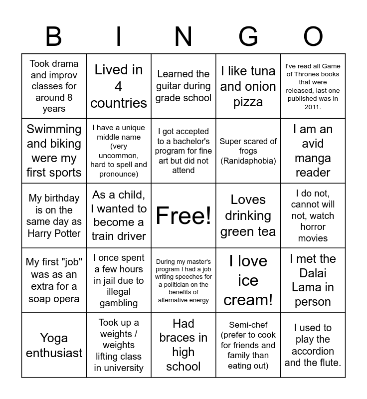 This bingo card has a free space and 28 words: I met the Dalai Lama in person, My middle name is Michael, Super scared of frogs (Ranidaphobia), Semi-chef (prefer to cook for friends and family than eating out), Swimming and biking were my first sports, Learned the guitar during grade school, Lived in 4 countries, My first "job" was as an extra for a soap opera, Loves drinking green tea, Yoga enthusiast, My birthday is on the same day as Harry Potter, I like tuna and onion pizza, Took up a weights / weights lifting class in university, Had braces in high school, I am an avid manga reader, When I was young, I wanted to become an entomologist, I once spent a few hours in jail due to illegal gambling, I have a unique middle name (very uncommon, hard to spell and pronounce), I got accepted to a bachelor's program for fine art but did not attend, During my master's program I had a job writing speeches for a politician on the benefits of alternative energy, Took drama and improv classes for around 8 years, Travelled for 38hrs across Argentina from north to south by bus. And then 38hrs back, total of 76hrs or 3.2 days. The most boring trip ever as it is all plain and flat territory with just cows., I used to play the accordion and the flute., As a child, I wanted to become a train driver, I do not, cannot will not, watch horror movies, I love ice cream!, I've read all Game of Thrones books that were released, last one published was in 2011. and I'm a BTS fan since 2016 and I'm planning to visit all the places they went to in Zurich..
