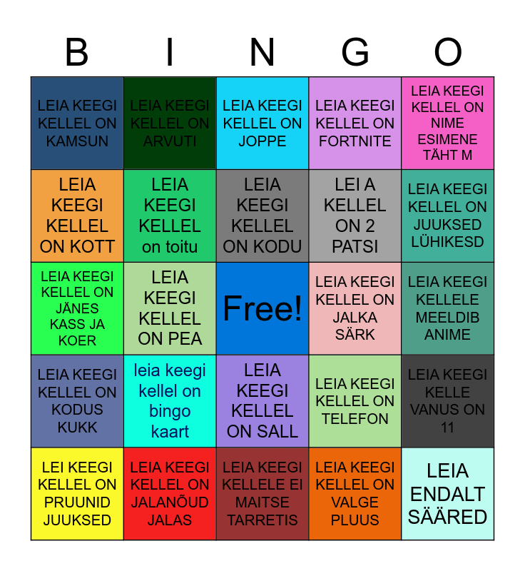 This bingo card has a free space and 24 words: leia keegi kellel on bingo kaart, LEIA KEEGI KELLEL ON JALANÕUD JALAS, LEIA KEEGI KELLEL ON KODU, LEI KEEGI KELLEL ON PRUUNID JUUKSED, LEIA KEEGI KELLEL ON NIME ESIMENE TÄHT M, LEIA KEEGI KELLEL ON KAMSUN, LEIA KEEGI KELLEL ON KOTT, LEIA KEEGI KELLEL ON ARVUTI, LEIA KEEGI KELLEL ON JALKA SÄRK, LEIA KEEGI KELLEL ON SALL, LEI A KELLEL ON 2 PATSI, LEIA KEEGI KELLEL ON JÄNES KASS JA KOER, LEIA KEEGI KELLEL ON TELEFON, LEIA KEEGI KELLE VANUS ON 11, LEIA KEEGI KELLEL on toitu, LEIA KEEGI KELLEL ON VALGE PLUUS, LEIA KEEGI KELLELE MEELDIB ANIME, LEIA KEEGI KELLEL ON JOPPE, LEIA KEEGI KELLEL ON JUUKSED LÜHIKESD, LEIA KEEGI KELLEL ON PEA, LEIA ENDALT SÄÄRED, LEIA KEEGI KELLEL ON KODUS KUKK, LEIA KEEGI KELLEL ON FORTNITE and LEIA KEEGI KELLELE EI MAITSE TARRETIS.