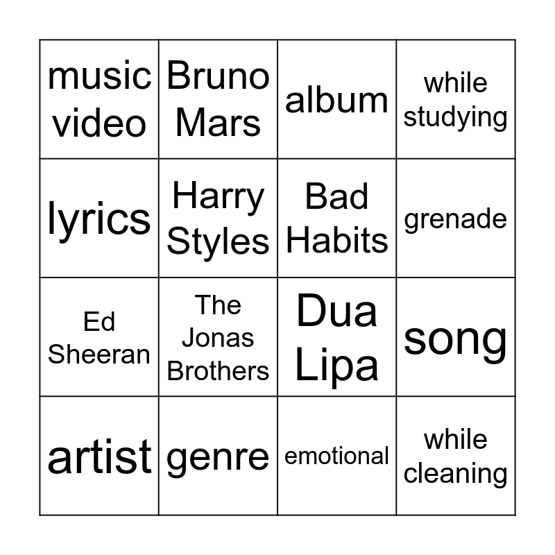 This bingo card has 20 words: song, pop music, album, rating, artist, lyrics, genre, music video, Ed Sheeran, Bruno Mars, The Jonas Brothers, Dua Lipa, Harry Styles, while cleaning, Bad Habits, annoying, grenade, while studying, emotional and Levitating.