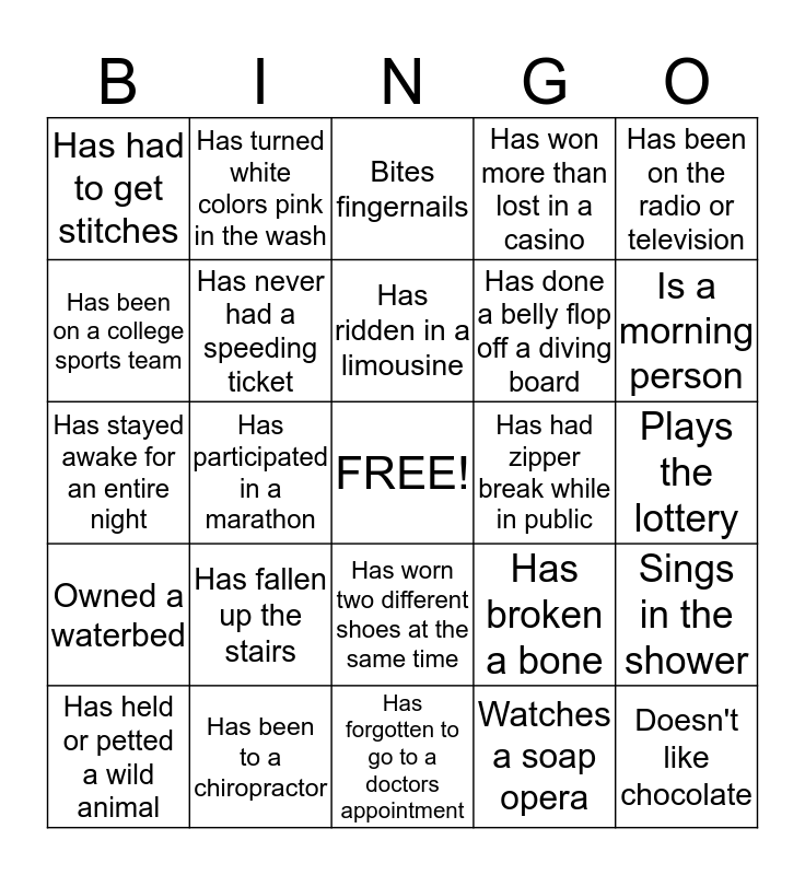 This bingo card has a free space and 24 words: Has fallen up the stairs, Has been to a chiropractor, Has ridden in a limousine, Has held or petted a wild animal, Has been on the radio or television, Has had to get stitches, Has been on a college sports team, Has turned white colors pink in the wash, Has had zipper break while in public, Has worn two different shoes at the same time, Has done a belly flop off a diving board, Has stayed awake for an entire night, Has broken a bone, Sings in the shower, Has never had a speeding ticket, Watches a soap opera, Plays the lottery, Bites fingernails, Is a morning person, Has participated in a marathon, Doesn't like chocolate, Owned a waterbed, Has won more than lost in a casino and Has forgotten to go to a doctors appointment.