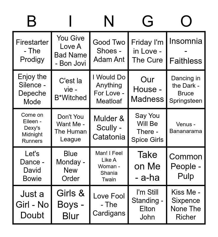 This bingo card has a free space and 30 words: Girls & Boys - Blur, Zombie - The Cranberries, Don't You Want Me - The Human League, Radio Gaga - Queen, Firestarter - The Prodigy, Good Two Shoes - Adam Ant, C'est la vie - B*Witched, Man! I Feel Like A Woman - Shania Twain, Say You Will Be There - Spice Girls, Love Fool - The Cardigans, Venus - Bananarama, Kiss Me - Sixpence None The Richer, I'm Still Standing - Elton John, (Don't You) Forget About Me - Simple Minds, Dancing in the Dark - Bruce Springsteen, Hungry like the Wolf - Duran Duran, Take on Me - a-ha, Let's Dance - David Bowie, Blue Monday - New Order, Insomnia - Faithless, Come on Eileen - Dexy's Midnight Runners, Should I Stay or Should I Go - The Clash, You Give Love A Bad Name - Bon Jovi, Our House - Madness, Enjoy the Silence - Depeche Mode, Friday I'm in Love - The Cure, Common People - Pulp, Just a Girl - No Doubt, I Would Do Anything For Love - Meatloaf and Tragedy - Steps.