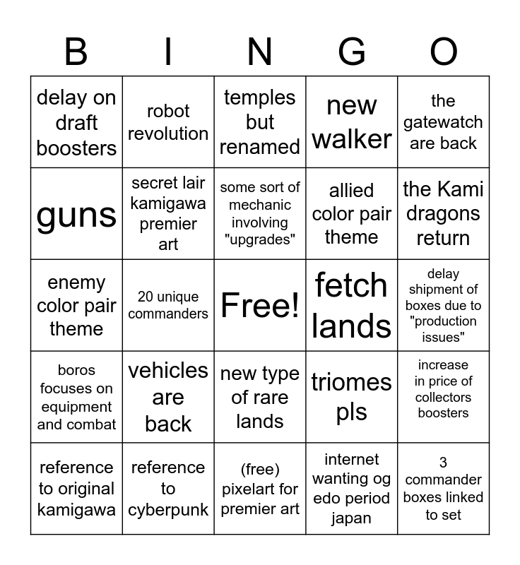 This bingo card has a free space and 24 words: vehicles are back, reference to cyberpunk, some sort of mechanic involving "upgrades", reference to original kamigawa, the gatewatch are back, delay on draft boosters, guns, robot revolution, fetch lands, new type of rare lands, allied color pair theme, enemy color pair theme, triomes pls, increase in price of collectors boosters, secret lair kamigawa premier art, internet wanting og edo period japan, delay shipment of boxes due to "production issues", temples but renamed, the Kami dragons return, 20 unique commanders, 3 commander boxes linked to set, boros focuses on equipment and combat, new walker and (free) pixelart for premier art.