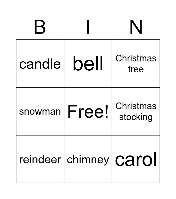 This bingo card has a free space and 14 words: Santa Claus, sleigh, reindeer, bell, snowman, carol, candy cane, present, chimney, candle, wreath, Christmas stocking, Christmas tree and ornaments.