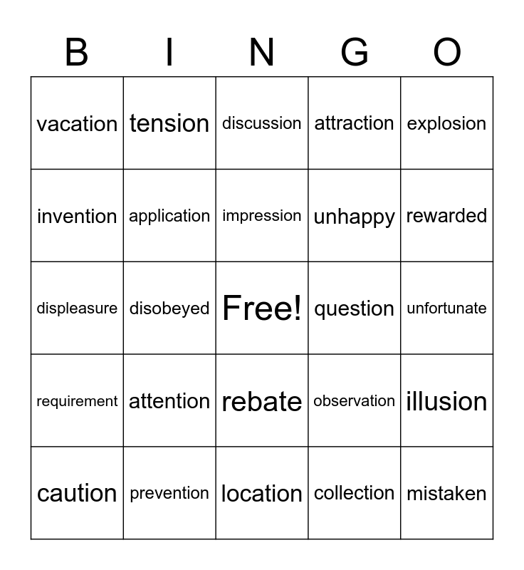 This bingo card has a free space and 25 words: attention, location, impression, caution, explosion, vacation, invention, tension, question, rebate, unhappy, displeasure, observation, illusion, application, direction, unfortunate, discussion, rewarded, disobeyed, mistaken, prevention, requirement, attraction and collection.