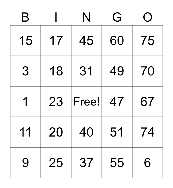 This bingo card has a free space and 24 words: 9, 20, 31, 55, 75, 15, 17, 45, 47, 67, 1, 18, 51, 74, 3, 25, 37, 60, 70, 11, 23, 40, 49 and 6.