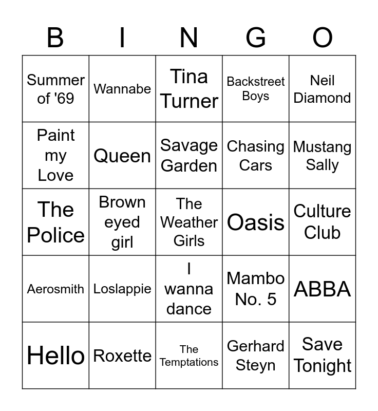 This bingo card has 32 words: Gerhard Steyn, Vanessa Colton, Brown eyed girl, Taylor Swift, Aerosmith, Queen, Neil Diamond, ABBA, Wannabe, Save Tonight, Savage Garden, Tina Turner, Uptown girl, Elton John, Oasis, Johnny Cash, Hello, The Police, I wanna dance, Loslappie, Mambo No. 5, Soak up the sun, Culture Club, Roxette, The Weather Girls, Backstreet Boys, Chasing Cars, Paint my Love, Summer of '69, The Temptations, Eternal Flame and Mustang Sally.