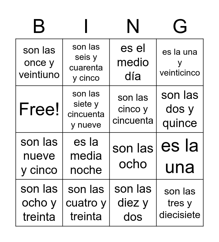 This bingo card has 16 words: son las cuatro y treinta, es la una, es el medio día, son las once y veintiuno, son las nueve y cinco, son las seis y cuarenta y cinco, son las ocho, son las diez y dos, Free!, son las siete y cincuenta y nueve, son las ocho y treinta, es la una y veinticinco, es la media noche, son las dos y quince, son las cinco y cincuenta and son las tres y diecisiete.