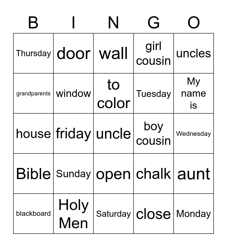 This bingo card has 25 words: Sunday, Saturday, to color, blackboard, uncles, Thursday, grandparents, door, boy cousin, open, Tuesday, house, chalk, aunt, window, Monday, Wednesday, wall, My name is, friday, uncle, Holy Men, Bible, girl cousin and close.
