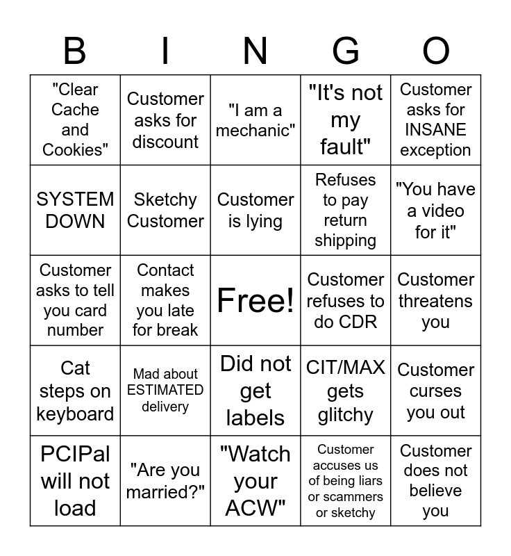 This bingo card has a free space and 55 words: Customer Cannot use PCIPal, PCIPal will not load, "iT sAiD gUaRaNtEeD tO fIt", "Clear Cache and Cookies", "Watch your ACW", ManSplaining, Sketchy Customer, Customer doing something gross, Refuses to pay return shipping, "I ordered the right parts", "It's not my fault", Customer calls you a pet name, Multiple customer on call, Crazy things in background, Customer asks you to hold, Escalation, Customer asks for INSANE exception, Contact makes you late for break, Customer refuses to give vehicle info, Customer does not believe you, Customer refuses to do CDR, Customer did NOT read listing, CIT/MAX gets glitchy, "I am a mechanic", Customer says they know what they are talking about but doesn't, Customer is lying, Customer accuses us of being liars or scammers or sketchy, Customer threatens legal action, Customer threatens you, Customer curses you out, "I need to speak to a man", Customer asks for tech/mechanic, Customer asks for more info on part we do not carry, Customer does not understand "NO", SYSTEM DOWN, Customer asks to tell you card number, "Can I text you a picture?", Cat steps on keyboard, Customer hung up, Customer asks for "total with tax", Customer asks for discount, "But I saw it online", Signify Cancel, Same Day Delivery, Mad about ESTIMATED delivery, "Are you married?", Customer hits on you, Customer mad about damaged packaging, Customer mentions YouTube videos, "You have a video for it", Tries to return order over a year old, "Is that both?", "Are bulbs included?", Did not get labels and Customer flushes and does not wash hands.